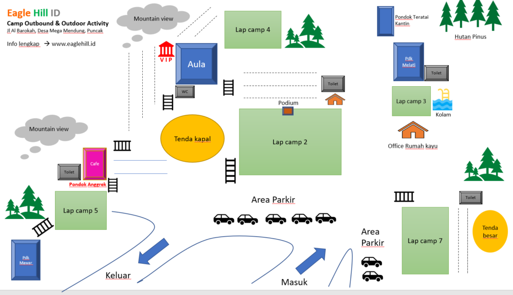 Puncak Bogor merupakan kawasan wisata pegunungan yang menjadi destinasi utama bagi warga Jabodetabek karena udara sejuk, pemandangan alam dan jaraknya yang relatif dekat. . Di Puncak juga banyak terdapat Tempat wisata, Hotel, Resort, Penginapan, tempat camping serta berbagai resto dan tempat kuliner yang menarik. Setiap tempat tentunya mempunyai keunikan dan keistimewaan masing2 dan pemilihan tempat yang akan dikunjungi atau menginap tentunya tergantung dari berbagai faktor seperti tema acara, budget, jumlah orang dan lain sebagainya. Salah satu pilihan tempat yang ada di Puncak adalah Eagle Hill Indonesia, sebuah tempat perkemahan private multi guna yang telah dipercaya oleh berbagai kalangan sekolah, kampus, perusahaan, komunitas, dan lainnya selama lebih dari 20 tahun sebagai tempat berkegiatan.